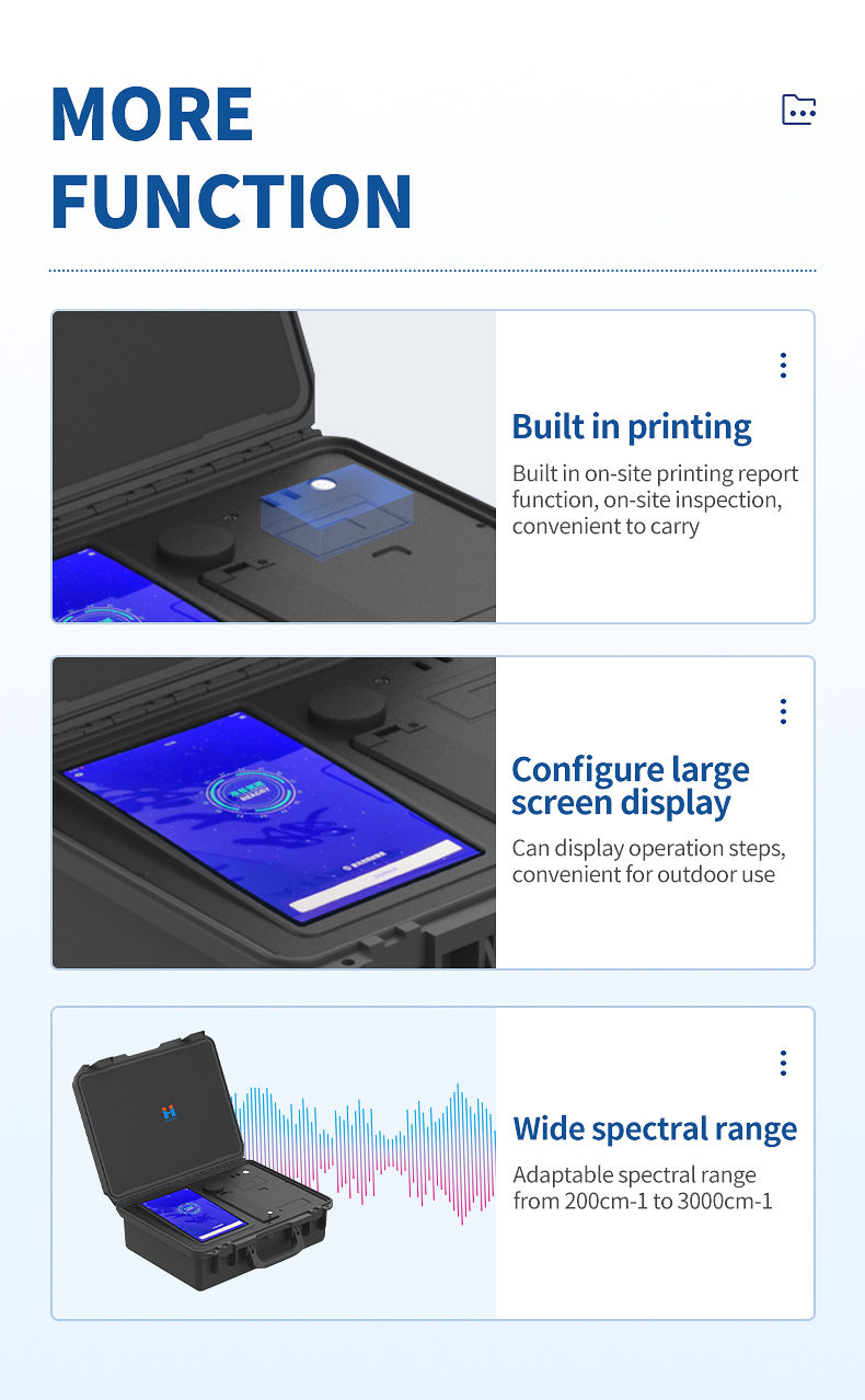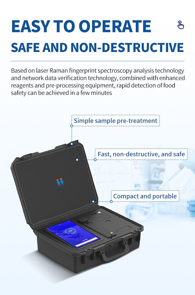 This instrument can quickly and accurately detect illegal additives, chemical additives, and doping substances in daily food. Based on laser Raman fingerprint spectroscopy analysis technology and network data verification technology, combined with enhanced reagents and pre-processing equipment, it can achieve rapid detection of food safety in just a few minutes. Specially designed for on-site law enforcement and rapid screening detection, easy to use and simple to operate. By combining enhanced reagents and pre-processing equipment, rapid detection of food safety can be achieved in just a few minutes.