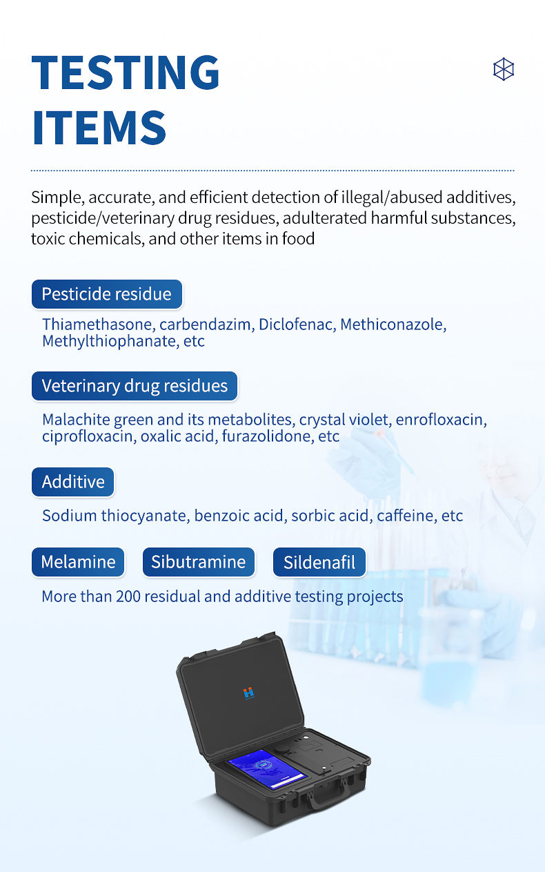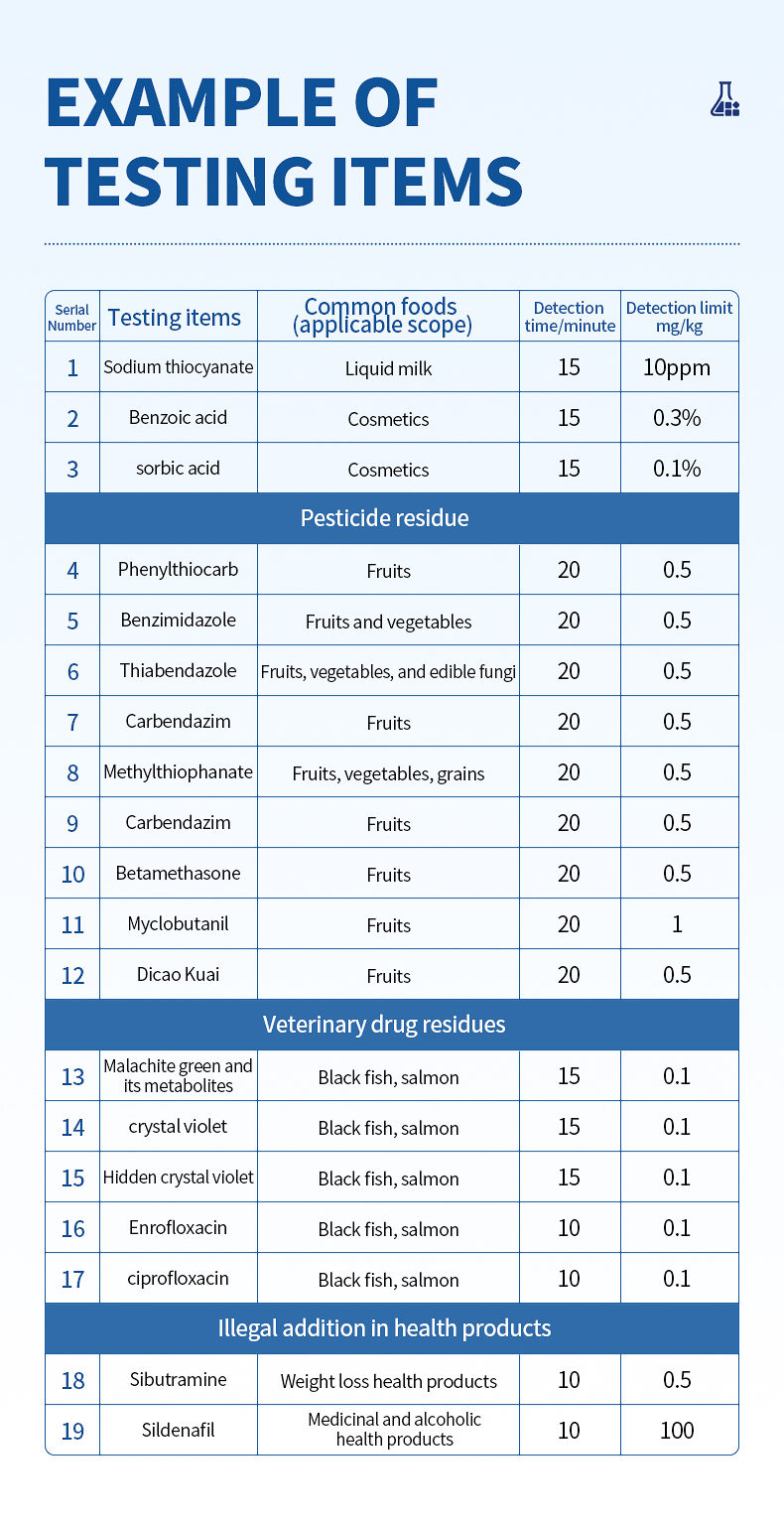 Pesticide residues (Thiabendazole, Carbendazim, Diclofenac, Imidacloprid, etc.), veterinary drug residues (Malachite Green and its metabolites, Crystal Violet, Enrofloxacin, Ciprofloxacin, Oxalic acid, Furazolidone, etc.), additives (Sodium thiocyanate, Benzoic acid, Saric acid, Caffeine, etc.), melamine, Sibutramine, Sildenafil, and more than 200 residue and additive detection projects, and customized projects can be customized according to customer needs.