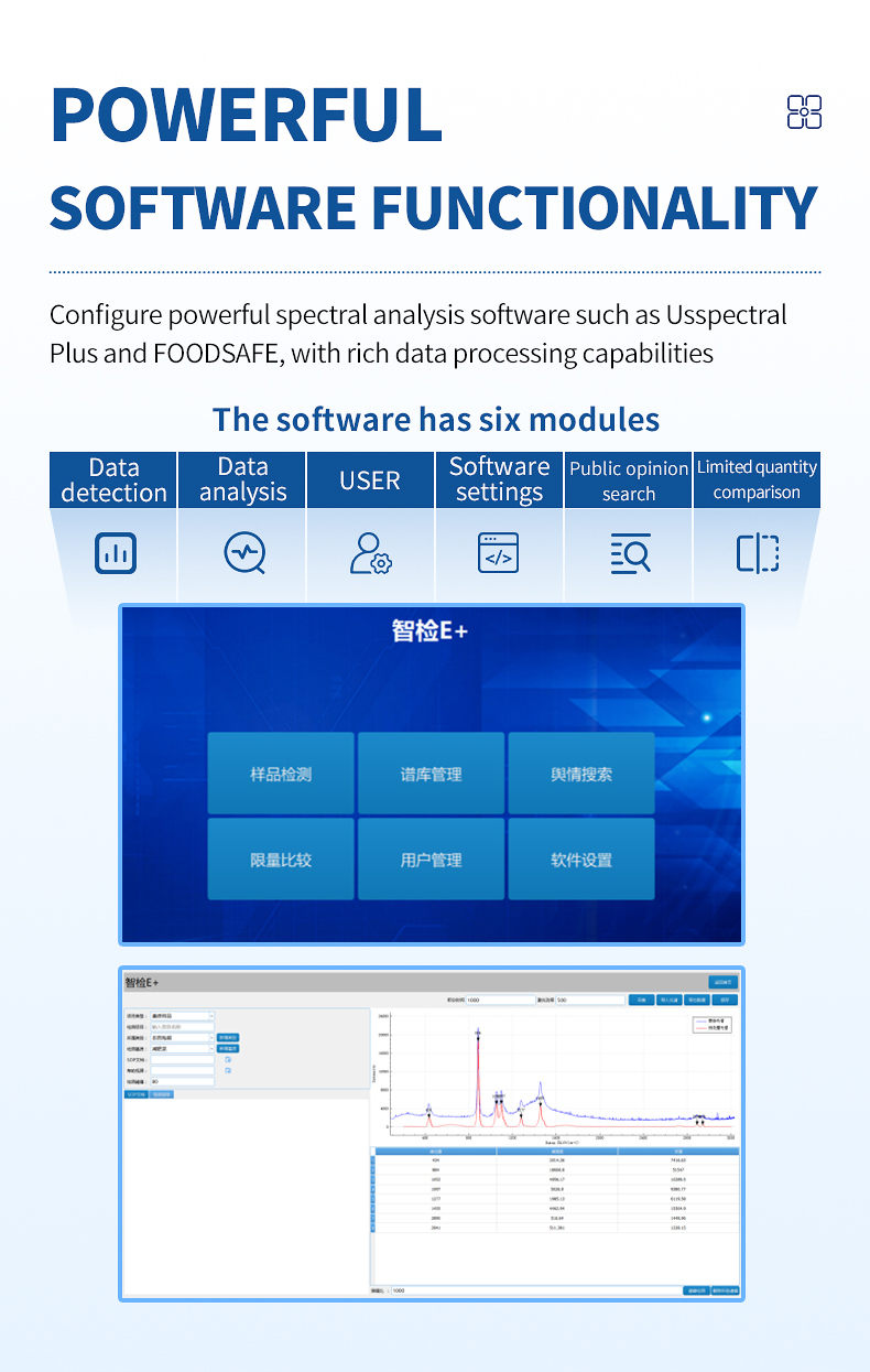 The powerful Uspectral Plus and FOODSAFE spectrometer analysis software are equipped with rich data processing capabilities;